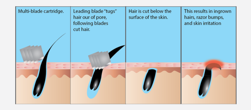 可是想想,這樣的價格倒也還好,於是想找些資料,佐證這個科技的發明是不是有百利而無一害,於是找到這篇:『 多刀片設計的刮鬍原理是,第一片刀片切進鬍鬚時,也會將鬍鬚從毛囊往外拉出幾奈米,好讓下一片刀片刮掉,因此來回幾次後也會刮掉皮膚表面底下的鬍子。聽起來很棒,但由於鬍子低於皮膚表面,之後便很容易直接往皮膚裡生長,造成不舒服的疼痛感,臉上腫腫的小紅點就是這樣來的! 』