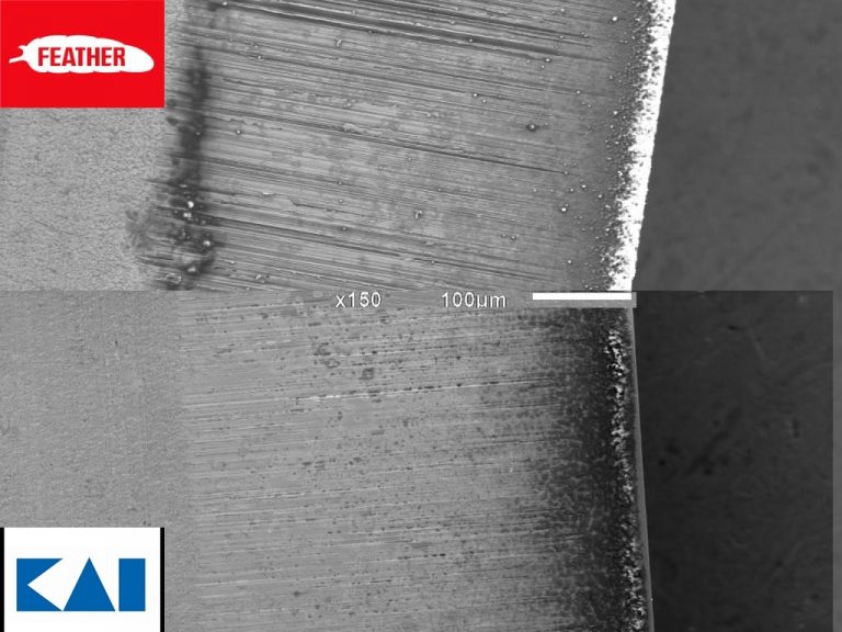我們將兩片刀片對比,放大150倍比較。上圖是FEATHER,下圖是KAI。